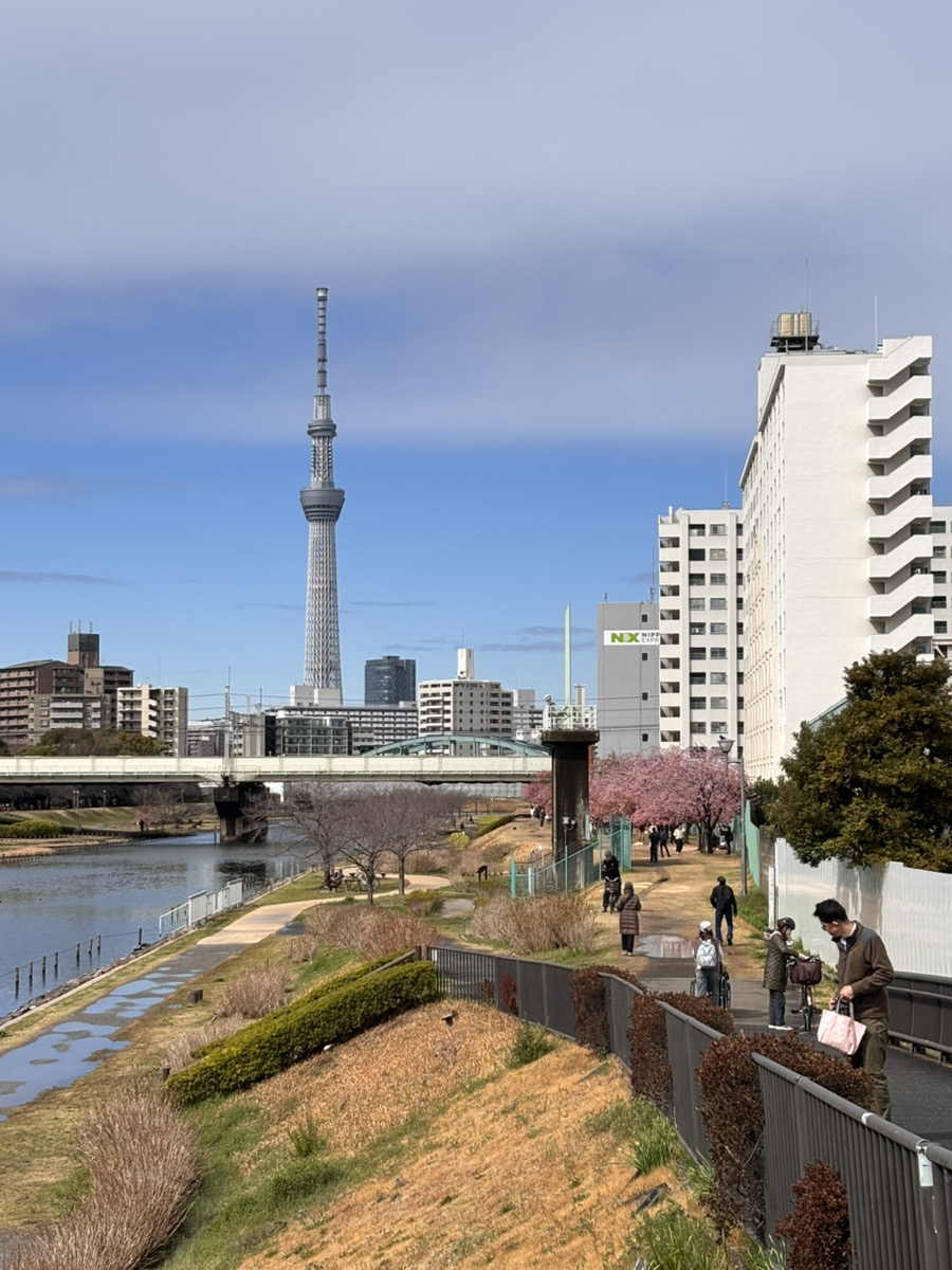 スカイツリーと河津桜があり、とても雰囲気が良い川沿いでした。今年の桜の季節は平井を散歩してみてはいかがでしょうか。